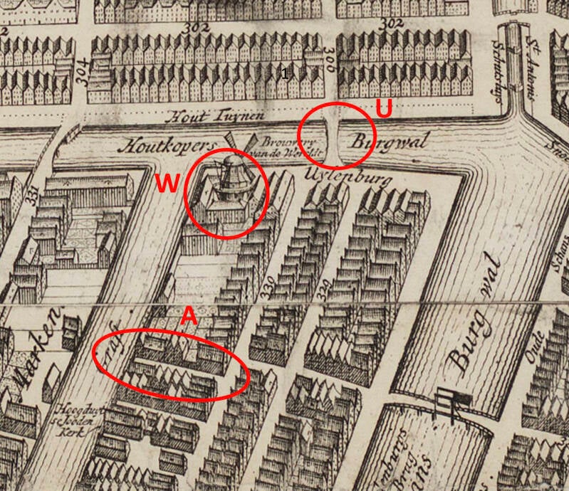 Zuidkant van het Eiland Uilenburg in Amsterdam. Hierop de Uilenburgerbrug ("B"), Brouwerij de Wereld met molen ("W") waar Cieper wonde en de Achterstraat ("A") waar Roosje woonde. Zuid is boven Plattegrond Gerrit de Broen 1728-1737. Stadsarchief Amsterdam.